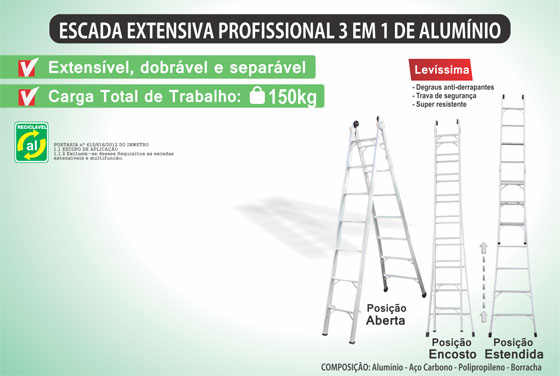 Diferencial: Essa escada permite o uso em 3 posições (fechado, aberta e estendida). Além disso, você pode usar a escada em ambos os lados sem a necessidade de movimentá-la. Permite também acesso a lugares elevados com muita flexibilidade e segurança. Além de ter mais funcionalidade que os concorrentes, esse produto foi produzido para ter maior resistência com perfis mais largos, trazendo mais segurança e durabilidade.